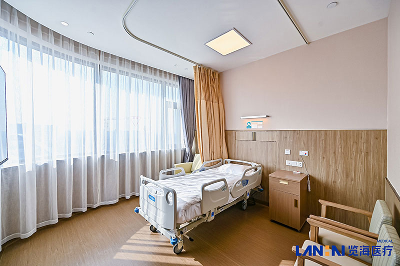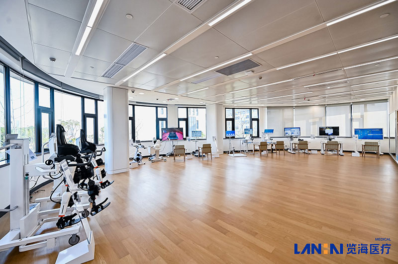 院内康复治疗区域面积4000平方米,三个康复治疗大厅配备有下肢康复机器人、三维上肢多关节训练与评估系统、运动肺功能测试与康复,医院康复病房配备有美国 Hill-Rom 高端电动床等智能尖端康复设备。病房通过构建全方位适老化环境与人文关怀体系,在保障医疗功能的基础上,着力打造安全、舒适、有温度的治疗空间:采用防滑地板、连续扶手,确保老年人安全,全面构建起兼顾生理需求与情感关怀的老年友好型医疗环境。